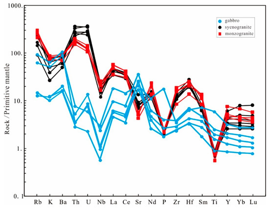 Primitive mantle normalized trace element spider patterns of intrusive rocks (normalizing factors are from [43]); Primitive mantle compositions are from [44].
