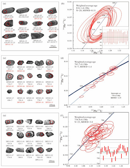 (a)—Cathodoluminescence (CL) images of zircons of the gabbro (DP-141); (b)—LA-ICP-MS zircon U-Pb concordia diagram of the gabbro (DP-141); (c)—Cathodoluminescence (CL) images of zircons of the syenogranite (DP-205); (d)—LA-ICP-MS zircon U-Pb concordia diagram of the syenogranite (DP-205); (e)—Cathodoluminescence (CL) images of zircons of the monzogranite (DP-212); (f)—LA-ICP-MS zircon U-Pb concordia diagram of the monzogranite (DP-212).