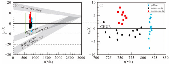 (2) The weighted average age of the gabbro was 816.1 ± 4.1 Ma; the weighted average age of syenogranite was 783.7 ± 8.1 Ma, and that of the monzogranite was 754.8 ± 6.1 Ma, all of which were formed in the Neoproterozoic era.