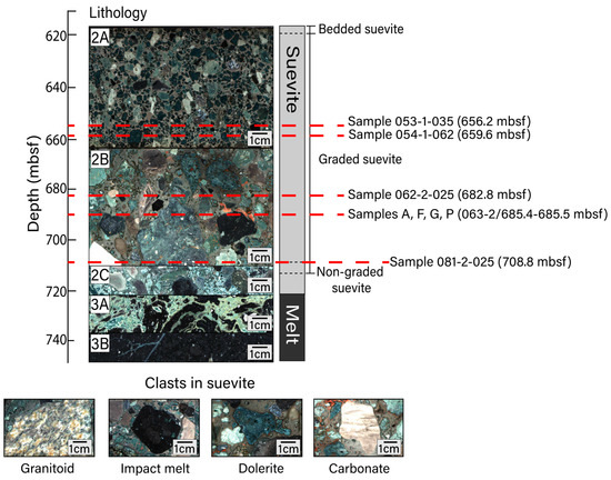 Upper peak ring lithological units with depth. Unit 2 is composed of suevite and is divided into subunits 2A (617.22–664.52 mbsf; image from core section 53-1), 2B (664.52–712.83 mbsf; image from core section 67-1), and 2C (712.83–721.62 mbsf; image from core section 84-2). Unit 2 is further divided into bedded, graded, and non-graded suevite. Unit 3 is composed of impact melt rocks and is divided into subunits 3A (721.62–737.56 mbsf; image from core section 88-4) and 3B (737.56–747.02 mbsf; image from core section 95-1). Subunit depth boundaries are defined in [32]. Representative images of clast types within the suevite include (sample name/sample depth in mbsf) granitoid (081-3-007/710.06 mbsf), impact melt (081-3-020/710.19 mbsf), dolerite (066-1-022/689.58 mbsf), and carbonate (063-3-008/686.07 mbsf) lithologies. Thin sections for this study were prepared for samples at the depths noted. All images shown in this figure are macroscopic digital line scan photos that were obtained from drill core archive halves during the Expedition 364 Onshore Science Party. All line scan images from Expedition 364 are publicly available and were obtained from the Bremen Core Repository curatorial database (doi:10.1594/PANGAEA.881718 (accessed on 17 February 2023)).