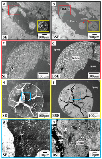 SE (first column) and BSE (second column) images of polishing debris in sample P/~685.5 mbsf. Close-up images (c–h) are outlined in the same color as the boxes shown in context images (a,b,e,f). Debris is documented in bubbles in epoxy and in thin section material near the edges of the sample.
