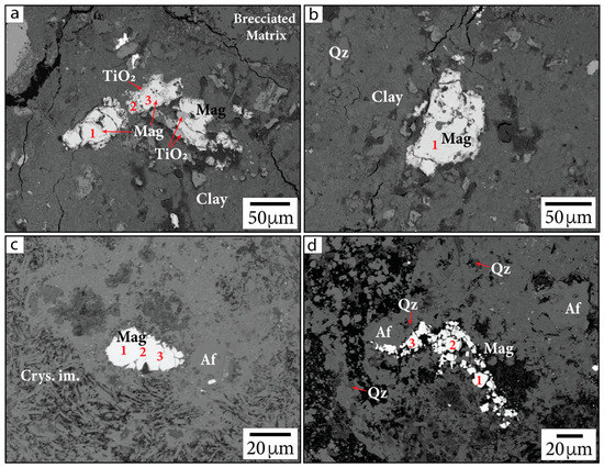 Primary Fe-oxide phases in BSE images. (a,b) Sample G/~685.43 mbsf; (c,d) sample P/~685.5 mbsf. Samples are identified in the following format: sample name/depth in mbsf. Numbers indicate locations of calibrated quantitative EDS analyses. Mag = magnetite, Crys. im. = crystallized impact melt, Qz = quartz. Af = alkali feldspar group minerals, following the nomenclature of [37].