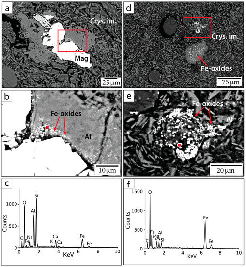 The large primary Fe-oxide grains are also associated with smaller (sub-micrometer to micrometer in diameter) Fe-oxide phases along the crystal boundaries (Figure 5a–c). It is unclear whether the decomposition is due to shock metamorphism, entrainment into super-heated impact melt, or hydrothermal decomposition. Smaller Fe-oxide minerals (<5 µm) are also visibly dispersed throughout or clustered within partially crystallized impact melt (Figure 5d–f). Many of these grains were too small for mineralogy to be determined using quantitative EDS or WDS. Such Fe-oxide grains may either be secondary minerals precipitated from hydrothermal fluid circulation or primary material. We are unable to conclusively state their origin based on petrographic imaging alone. However, we note that Ti was not detected in EDS measurements of these grains and that Ti concentrations have been observed to be lower in hydrothermal magnetite compared to igneous magnetite [41]. Because Ti is inferred to be relatively immobile in hydrothermal settings [42,43], it may not be readily incorporated into hydrothermally precipitated magnetite. Based on the Curie temperatures produced from susceptibility vs. temperature (k-T) curves from previous rock magnetic studies, stoichiometric magnetite, Ti-bearing magnetite, and maghemite are present within suevite samples, while hematite is not reported [1,44]. This can be useful for deciphering the origin of Fe-oxide phases.