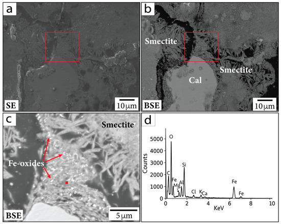 (a) SE and (b) BSE images of region containing sub-micrometer Fe-oxide crystals in sample P/~685.5 mbsf. (c) Magnified image of the area within the red outlined boxes in (a,b). Red square in (c) shows location corresponding to EDS spectrum in (d). Cal = calcite. Smectite = smectite group minerals.