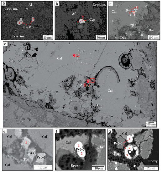 BSE images of Fe-sulfide grains in (a,b,d–g) sample P/~685.5 mbsf and in (c) sample F/~685.42 mbsf. Figure parts (e,f) show magnified images of the red outlined regions in part (d). Numbers indicate locations of WDS analyses. Af = alkali feldspar group minerals. Cal = calcite. Ccp = chalcopyrite. Crys. im. = crystallized impact melt. Dac = dachiardite-Na. Py/Mrc = pyrite or marcasite. Py(+) = either Ni-, Cu-, or Co-bearing pyrite or aggregates of pyrite crystals with other Ni-, Cu-, and Co-bearing phases. Smectite = smectite group minerals. Ttn = titanite.