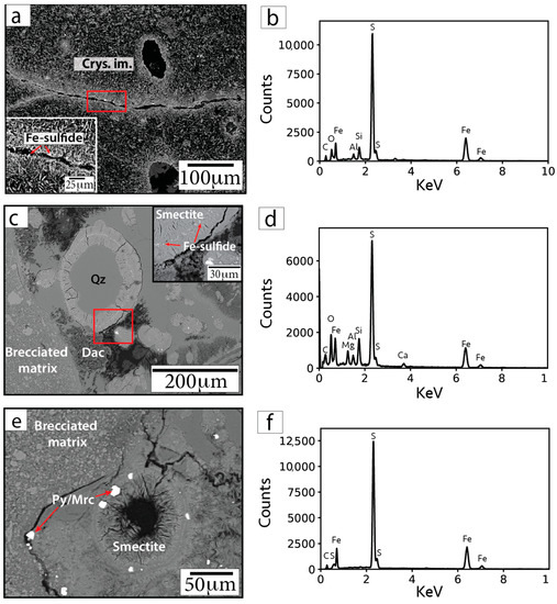 While the context of some Fe-oxide and Fe-sulfide minerals can be obvious, such as inherited primary grains, the natures of many phases are elusive. Quantitative X-ray microanalysis (EDS and WDS) is only possible for grains that are larger than the beam–specimen interaction volume, which is dependent on sample composition and analytical conditions. Monte Carlo simulations of electron trajectories in programs such as CASINO [46,47] yield diameters of the interaction volumes on the order of 3 to 5 µm for Fe-Ti oxides and Fe-sulfides at 15 kV. Many of the oxides and sulfides in our samples are within or smaller than this size range, and therefore EDS and WDS analyses often contain X-rays generated by surrounding materials. For larger grains, analytical spots were chosen, where possible, within a homogeneous region and several micrometers away from surface imperfections (pits, cracks), grain boundaries, inclusions, and intergrowths. However, many grains have heterogeneous textures. Therefore, our analyses are considered to represent both the targeted grain and any primary lamellae, inclusions, or intergrowths, and/or secondary replacement textures (e.g., TiO2 rims and lamellae in Figure 4a). For these reasons, quantitative identification of the oxides and sulfides is not always possible. A recent study of hydrothermal alteration within Hole M0077A reports unresolvable micrometer-sized oxides within devitrified glass clasts [48]. Our imaging results reveal that sub-micrometer to micrometer Fe-oxide crystals are also associated with clay. We acknowledge that our EDS/WDS results reflect the limitations of the use of SEM/EPMA to quantify such small phases; however, it is evident that the crystals analyzed contain pure Fe-cation spikes and are likely magnetite or maghemite (based on previous rock magnetic property analyses) and that their EDS spectra contain elements from overlapping and surrounding clay minerals. Similar methods have been used to document the growth of authigenic micrometer-scale magnetite crystals in Devonian carbonates [49,50]. Weil et al. [49] report that Fe-oxide minerals were found in association with likely fluid pathways such as cracks, veins, and grain boundaries. The cogenetic relationship between Fe-oxide minerals and fluid pathways implies that the authigenic reaction took place within fluids. Comparably, we interpret the Fe-rich minerals located in cracks, veins, grain boundaries, and clay-infilled voids within our samples to be evidence of precipitated phases due to hydrothermal fluid flow. Subsequent studies would benefit from additional quantitative techniques such as X-ray diffraction, Raman spectroscopy, and the use of fresh, unpolished surfaces to verify our EDS- and WDS-based interpretations.