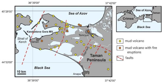 Location map of mud volcanoes in the Taman Peninsula (Kerch–Taman MV Province), modified after Shnyukov et al. [23].