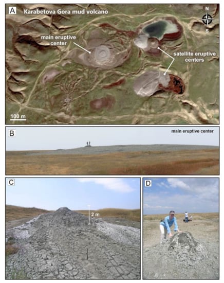 Study area and field view of Karabetova Gora MV, August 2008. (A) Panoramic view of Karabetova Gora MV. Google Earth image, 2016 (https://www.google.com/intl/ru/earth/, accessed on 5 December 2022). (B) Main eruptive center extruding plastic mud. (C,D) Bubbling satellite gryphons.