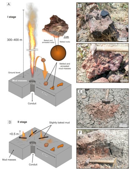 Model of Karabetova Gora MV fire eruption of 6 May 2000 and distribution of CM rocks. (A,D) Fire history. Color codes are: gray for unaltered mud; orange for slightly annealed mud and clinker (color intensity is proportional to degree of CM alteration); brown and black for paralava. (B,C) Blocks of clinker and paralava formed upon direct contact with flame (Stage I). (E) Reddish thermally altered rocks around the foci of burning venting gas (Stage II). (F) Reddish annealed mud in heavily fractured mud cover (Stage II).