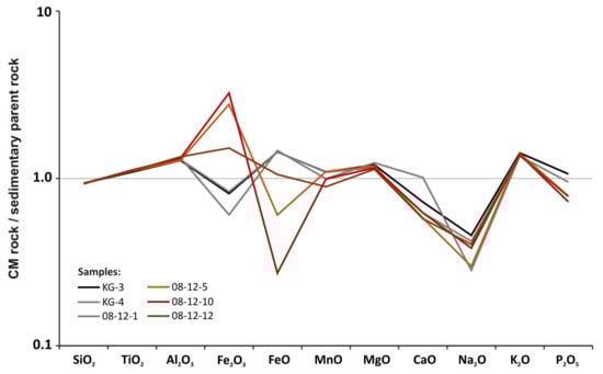 Major-element patterns for the Karabetova Gora CM rocks normalized to protolith composition (mud composed of Middle Maykop shale), based on data from Table 1.