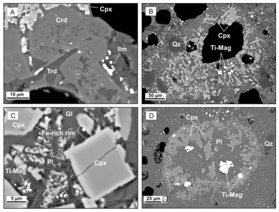 Cordierite often occurred as tiny (<20 µm) pseudohexagonal short-prismatic crystals lining the walls of gas vesicles (Figure 5d,e and Figure 6a) or appeared as prismatic crystals and anhedral grains in the groundmass. In the latter case, it had cores stuffed with tridymite and glass inclusions but the cordierite that grew around vugs virtually lacks inclusions. These morphological features are typical of CM cordierite [11,12,15,47]. Clinopyroxene existed as flat 5–20 µm crystals (Figure 6b–d), anhedral grains, or skeletal and hopper crystals (Figure 5d and Figure 7d). Plagioclase formed laths or anhedral grains set in glass, while its clusters were mostly abundant in the glassy matrix on the block surfaces (Figure 5b,c and Figure 6c,d). Opaque minerals in the paralavas were intermediate members of the magnetite–ulvöspinel solid solutions, magnetite–magnesioferrite solid solution series, and ilmenite (Figure 5c, Figure 6a,d, and Figure 7). Fine aggregates of opaque minerals were localized in the outer zone most strongly affected by the thermal impact, within 1.5 cm below the surface. Skeletal and/or hopper crystals of opaque phases clustered on the periphery of pores (Figure 7a,b) or in thin bridges between them.