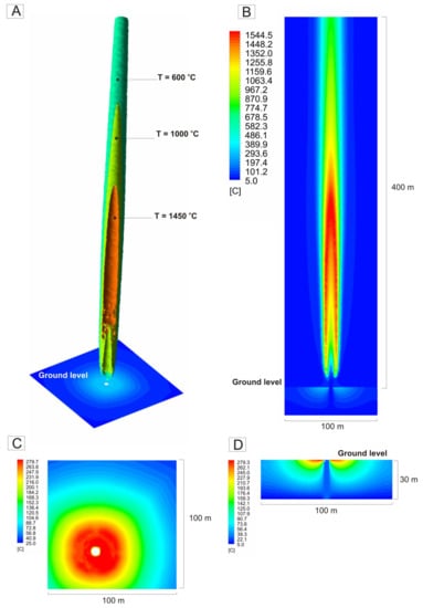 Natural straight-flow vertical gas flare and its temperature pattern. (A) Color-coded isothermal surfaces: blue, green, and red colors correspond to temperatures of 600, 1000, and 1450 °C, respectively, and ground temperatures (°C). (B–D) Temperature fields (°C) in the central section (B), on ground surface (C), and to 30 m below the surface (D).