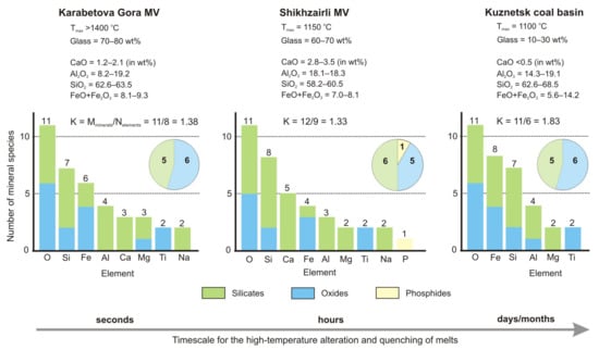The compared mineral-forming systems contain specific sets of chemical compounds. Annealed and fused metapelitic CM rocks tend to lose more than 90% of volatiles and up to 2/3 Na, but not potassium. As a result, CM melts are K-Al silica-rich and crystallize to form anhydrous Na-depleted mineral assemblages, mostly simple anhydrous oxides and silicates of major elements (Si, Al, Fe, Mg, Ca, Ti, K). In the known ordinary cases of natural and human-induced coal fires, CM assemblages are formed in the conditions of (i) high temperature, low pressure, and heating duration from several months to several years in any local spot; (ii) high chemical heterogeneity of sedimentary protoliths; (iii) gas convection; and (iv) high temperature and redox gradients. Jointly, these conditions lead to the formation of exceptionally diverse prograde CM mineral assemblages. They are especially diverse in hybrid rocks resulting from high-temperature alteration of carbonate and pelitic substrates, marly and phosphatic sediments with high trace-element loading, as well as molten rocks and assemblages of gas transport in gas chimneys. In these cases, a lot of minor and trace elements (F, Cl, P, S, Se, As, Sr, Ba, Zn, Cd, Cr, Ni, Mn, Mo, U, Pb, Ce, Th, Zr, Sn) become important mineral-forming agents besides the major elements (O, Si, Al, Fe, Mg, Ca, Ti, K, and rarer Na), and yield numerous combinations from bi-element to six-element compounds [13,15,20,26,50,55,64,65,66,67].