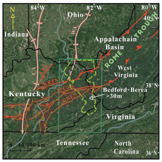 Figure 1. Tectonic map of central Appalachian Basin and the study area. The green box indicates the location of the study area. Thick Bedford–Berea strata (more than 30 m) are distributed in the irregular yellow zone. Pink and red lines indicate arches and faults, respectively. CA = Cincinnati arch; WA = Waverly arch; LFS = Lexington fault system; KRFS = Kentucky River fault system; IPCFS = Irvine–Paint Creek fault system; RRFS = Rockcastle River fault system.