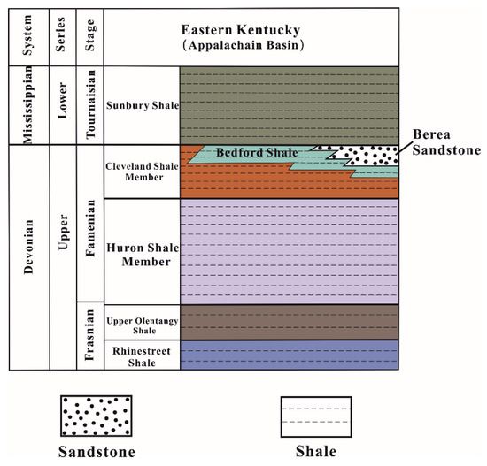 The studied Berea Sandstone was obtained from the Upper Devonian strata in northeastern Kentucky in the United States. The sampling site is located at the border of Kentucky, Ohio and West Virginia in the central Appalachian Basin (Figure 1). A cylindrical plug was drilled with dimensions of approximately 10 mm in diameter and 30 mm in length. The porosity and permeability data of Berea Sandstone published in the literature are listed in Table 1. Mineralogically, Berea Sandstone is mainly composed of quartz (usually above 60%) but also contains some feldspar, dolomite and clay minerals [33]. In eastern Kentucky, the Berea Sandstone is covered by the Lower Mississippian Sunbury Shale and underlain by the Upper Devonian Bedford Shale, which overlies the Cleveland and Huron Shale Members, Upper Olentangy Shale and Rhinestreet Shale (Figure 2). Berea Sandstone and Bedford Shale formed interpenetrating clastic wedges and were deposited in the storm shelf and slope environments caused by a forced regression during the end of the Devonian [35].