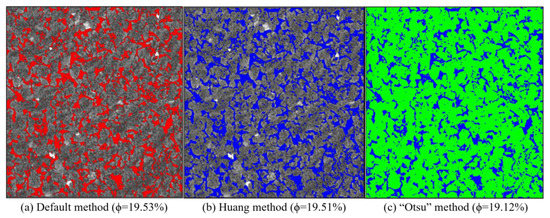 After the contrast enhancement and noise reduction operations, the brightness and contrast of the images were obviously increased, and the noises inherent in the imaging technique were also reduced (Figure 3). In this study, pores were segmented from these images by using the “Default”, “Huang” and “Otsu” thresholding methods. It is clear that the three methods yielded approximately the same segmentation results, and the obtained porosity data were seemingly close to each other (Figure 4).