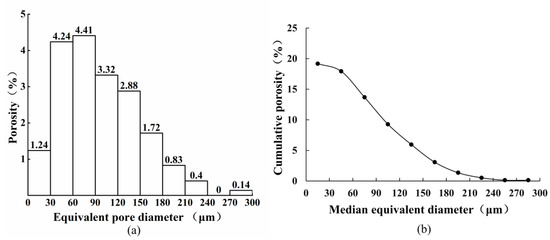 Figure 6. (a) Porosity distribution over an equivalent pore diameter range of 300 μm; (b) cumulative porosity plotted against median equivalent diameter.