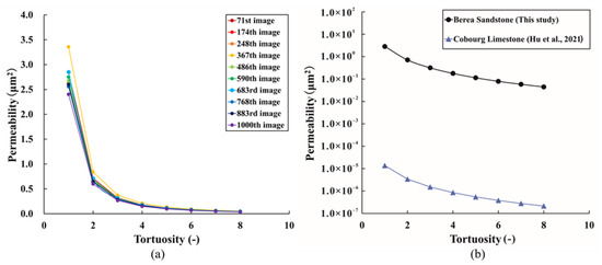 Figure 7. (a) Relationships between tortuosity values and permeability coefficients calculated on the pore geometry data from 10 selected images of Berea Sandstone; (b) relationships between tortuosity values and permeability coefficients calculated on the pore geometry data from the 683rd image of Berea Sandstone and BIB-SEM image of Cobourg Limestone [46].