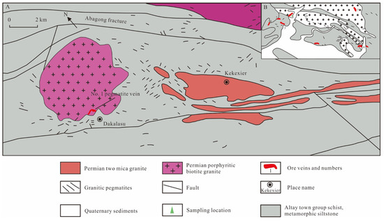Geological sketch of the Dakalasu pegmatite veins in the Altay region of Xinjiang, modified after [35,56]. (A) Geological overview of Dakalasu pegmatite ore cluster; (B) Simplified Geological Map of Dakalasu Be-Nb-Ta Ore District.