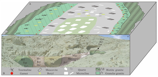 Schematic map of the mineral textural zonation of Dakalasu No. 1 pegmatite dyke, modified after [38]. (A) The layout of the Dakarasu No. 1 pegmatite vein zonation; (B) Dakalasu No.1 pegmatite vein zoning profile.