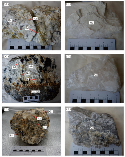 Photographs of ores from the Dakalasu No. 1 pegmatite vein. (A) Graphic texture zone; (B) Block microcline feldspar; (C) Contact zone between biotite granite and graphic texture pegmatite; (D) Rose quartz from the transitional zone; (E) Quartz—muscovite zone; (F) Quartz from the quartz core. Quartz = Qz; Albite = Ab; Microcline = Mc; Schorl = Srl; Beryl = Brl; Muscovite = Ms.