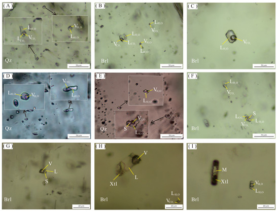 Microscopic photos of fluid and melt inclusions of the Dakalasu No. 1 pegmatite vein. (A,B) Three-phase CO2 inclusions and two-phase gas-liquid inclusions in quartz and beryl; (C) CO2-bearing two-phase aqueous inclusions in beryl; (D) Gas-liquid two-phase inclusions in quartz and CO2-bearing two-phase aqueous inclusions; (E–G) Daughter mineral-bearing inclusions and gas-liquid two-phase inclusions in quartz and beryl; (H) Fluid-melt inclusions coexist with CO2-bearing two-phase aqueous inclusions in beryl; (I) Crystalline silicate melt inclusions coexist with gas-liquid two-phase inclusions in beryl.