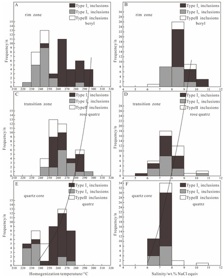 Homogeneous temperature and salinity histogram of the fluid inclusions from Dakalasu No. 1 pegmatite vein. (A,B) Histogram of homogenization temperature and salinity of fluid inclusions in beryl; (C,D) Histogram of homogenization temperature and salinity of fluid inclusions in in rose quartz; (E,F) Histogram of homogenization temperature and salinity of fluid inclusions in quartz.