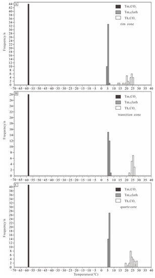 Histograms of CO2 melting temperatures, clathrate melting temperatures, and CO2 partial homogenization temperatures of type Ia and type Ib inclusions in Dakalasu No. 1 pegmatite vein. (A) Type Ia and type Ib inclusions in the rim zone; (B) type Ia and type Ib inclusions in the transition belt; (C) type Ia and type Ib inclusions in the quartz belt.