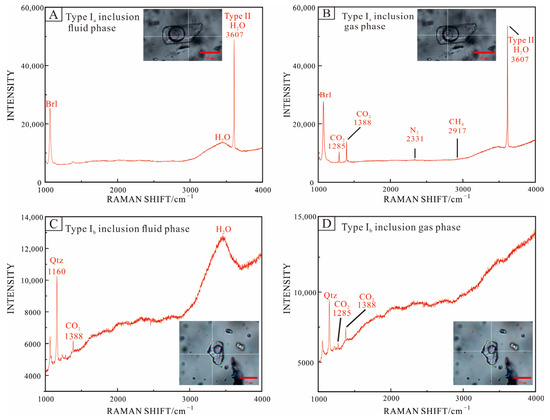 The results of Raman spectroscopy showed that the gas phase of type Ia inclusions contained significant CO2 characteristic peaks and modest levels of N2 and CH4; CO2 was detected in both the liquid and gas phases (Figure 9A,B). Two characteristic peaks of CO2 (1285 cm−1, 1387 cm−1) were clearly seen in the type Ib inclusions’ vapor and liquid phase, but N2 and CH4 were not recognized in the gas phase (Figure 9C,D). At 3607 cm−1, the characteristic peak of water in beryl crystal structure can be seen [69].