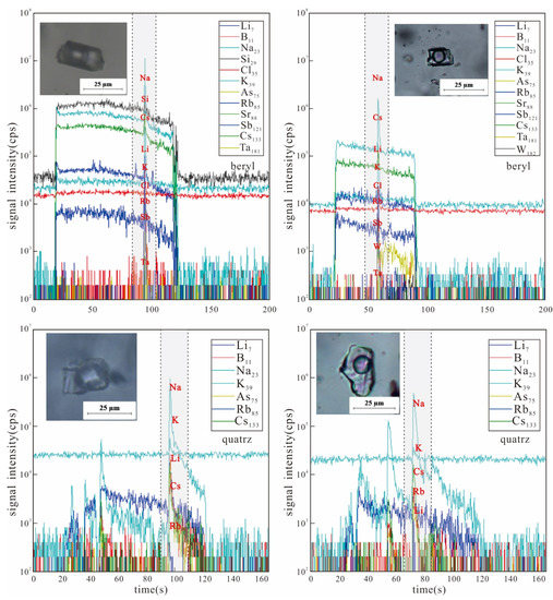 The CO2-bearing inclusions in the beryl of the rim zone show a certain amount of Li, B, K, Rb, etc. Among them, the highest contents of Li and B reached 2172 ppm and 34,407 ppm (absolute concentration with ±1σ uncertainty), respectively. The contents of Cs ranged from 669.6–3842 ppm. In contrast, the contents of Rb and Ta are lower, ranging from 54.74–322.9 ppm to 1.21–1.23 ppm, respectively.
