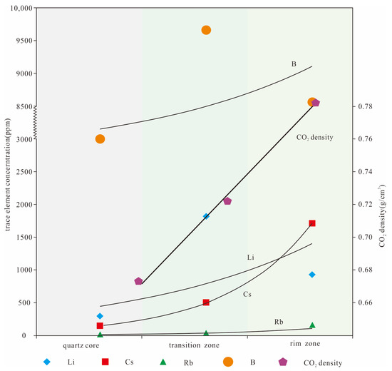 The fluid inclusions in various textural zones of the Dakarlasu No. 1 pegmatite vein are characterized by the richness of volatile components such as CO2, CH4, and N2. The calculated results show (Table 1) that the CO2 density from rim to core decreased from 0.71~0.84 g/cm3 to 0.65~0.78 g/cm3. The LA-ICP-MS analysis results also showed that the content of Li, B, K, Rb, Sr, and Cs decreased from the rim to the core zone. This synergistic variation relationship (Figure 11) partially reflects the possible contribution of CO2 to the migration and enrichment of these rare elements.