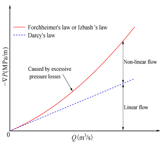 There are examples of non-Darcy flow in real environments such as oil exploration, mining development, and hydraulic engineering [39]. The Forchheimer equation, usually used to describe non-Darcy flow, is a further extension of Darcy’s law by adding a quadratic term that considers the effects of nonlinear inertia [40]. The results show that the Forchheimer equation can describe the seepage behaviors in pore-fracture media, expressed as follows: