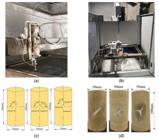 In Figure 4, waterjet cutting and wire cutting equipment are used to prefabricate sandstone samples with different inclinations, single, T-shaped, and Y-shaped fractures on standard samples (ϕ 50 × 100 mm). Figure 4c shows that the size of a single fracture is as follows: the length of the fracture is 20 mm, with an opening of 0.3 mm; the T-shaped and Y-shaped fractures are composed of three cracks of the same size, each of which is 10 mm long and has an opening of 0.3 mm. The geometries of single, T-shaped, and Y-shaped fractures are all characterized by parameter α. α represents the angle between fractures A, B, and F and the axial direction of the sample, and the values are 0°, 15°, 30°, 45°, 60°, 75°, and 90°. Figure 4d shows the final fractured sandstone sample. During the test, the cracks were likely to cause damage to the heat-shrinkable tube wrapping the sample due to the effect of the confining pressure, which could fail the test. Therefore, in the process of this test, the surfaces before and after the prefabricated fractures were plugged with gypsum and water (2:1) to ensure the normal progress of the test.