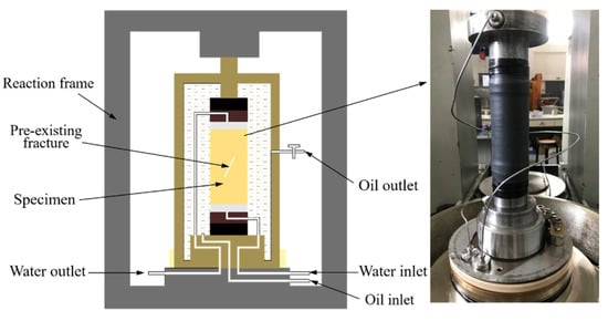 The TAW-2000 rock servo multifunctional test device was used for the seepage test on sandstone samples with single, T-shaped, and Y-shaped fractures to obtain hydraulic parameters under different confining pressures and hydraulic pressures. Before the test, all the fractured sandstone samples were soaked in a closed container filled with distilled water for 48 h. We ensured that the fractured sandstone samples were completely submerged by distilled water to make them fully saturated. In Figure 5, the seepage path goes from bottom to top. During the seepage test, the confining pressure and the water pressure were added successively. The latter was lower than the former.