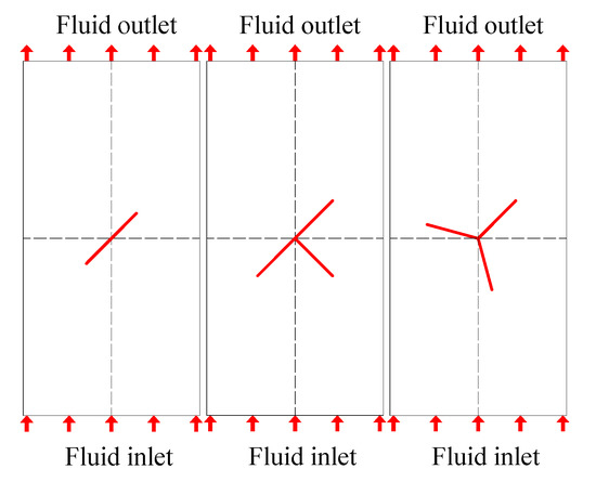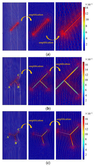 In the simulation process, it is assumed that the whole area has good sealing, the fluid flows from the bottom to the whole fracture area, and flows out from the top, and the rest of the boundaries are impermeable. The sample models of fracture (single fracture, T-shaped fracture, and Y-shaped fracture) with different shapes and inclination α = 45° are selected to carry out numerical simulation. It can be seen from the streamline distribution of fractured samples in Figure 11 that the streamline trajectory of fractured sandstones is affected by prefabricated fractures to a certain extent. In Figure 11a, the existence of single fracture will change the size and direction of water flow velocity. The water flow velocity changes with the change of permeability in the fracture. In the prefabricated single fracture, the seepage velocity in the fracture is relatively large due to the sudden increase in permeability, which is about 0.013 m/s. In Figure 11b, in the prefabricated T-shaped fracture, the water flow at A and B into C, and the seepage velocity at C, is relatively large, about 0.014 m/s. In Figure 11c, the water flow at B’ in Y- shaped fracture is diverted to A’ and C’, and the seepage velocity at B’ is relatively large, about 0.014 m/s.