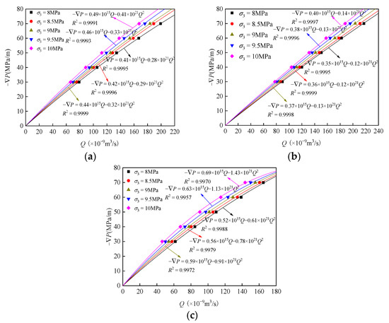 Fitting relationship between −∇P and Q of multi-fracture sandstone samples under different confining pressures: (a) SF45; (b) ST45; (c) SY45.