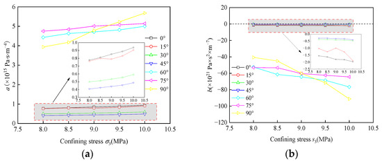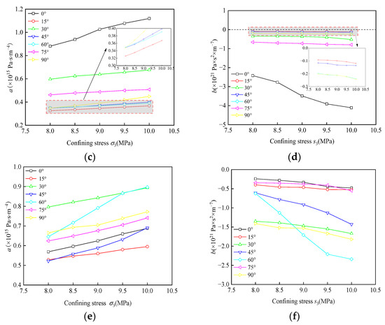 Variation characteristics of Forchheimer’s coefficients with the confining pressure under different inclinations and fractures: (a) Variation characteristics of linear term coefficient a of the single fracture; (b) variation characteristics of nonlinear term coefficient b of the single fracture; (c) variation characteristics of linear term coefficient a of the T-shaped fracture; (d) variation characteristics of nonlinear term coefficient b of the T-shaped fracture; (e) variation characteristics of linear term coefficient a of the Y-shaped fracture; (f) variation characteristics of nonlinear term coefficient b of the Y-shaped fracture.