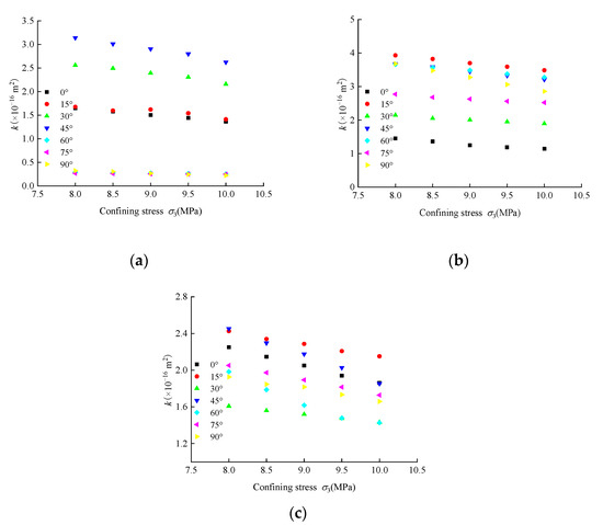 Variation characteristics of inherent permeability with the confining pressure under different inclinations and fractures: (a) Single fracture; (b) T-shaped fracture; (c) Y-shaped fracture.