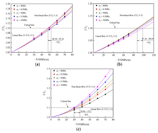 In Figure 10, T/T0 increases with the increased −∇P. The critical pressure gradient −∇Pc range is further determined using critical T/T0 to quantify the linear- and nonlinear-flow regions. If β is a negative value, then nonlinear effect E = −0.1, and the critical T/T0 = 1.1 in the work. Therefore, it can be determined that the critical pressure gradient −∇Pc ranges of SF45, ST45, and SY45 under different water pressures are 48.18–52.36 MPa/m, 87.16–98.09 MPa/m, and 29.81–37.3 MPa/m, respectively.