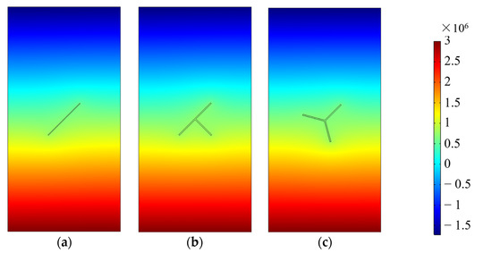 Seepage pressure distribution map of the sample: (a) Single fracture; (b) T-shaped fracture; (c) Y-shaped fracture.