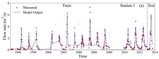 The performance of the drainage flow rate model during training and testing for the three stations. (a) Station 1 with training set from 1995–2013; (b) Station 2 with training set from 1996–2013; (c) Station 3 with training set from 1992–2013.