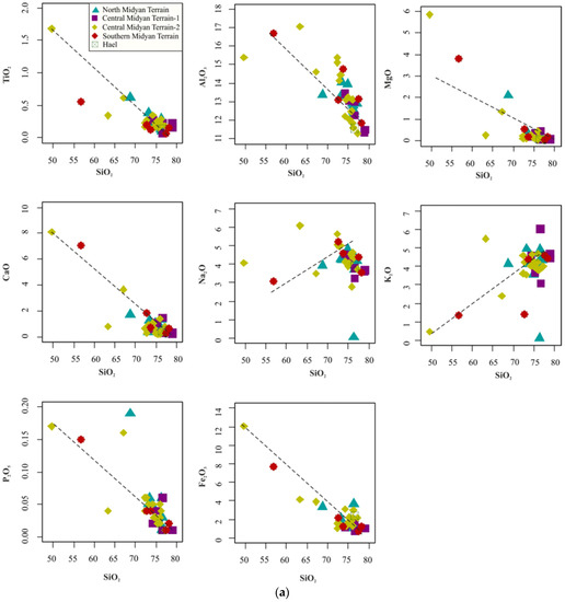 The major, trace, and rare earth elements (REES) of samples from the studied Midyan and Hael terrains are listed in Tables S1–S4. Most varieties have SiO2 concentrations greater than 70% and are thus classified as highly evolved felsic rocks. On a total alkali and silica (TAS) classification diagram [23] and in an R1-R2 multicationic diagram [24], the samples are mostly plotted in the alkali feldspar granite and syenogranite fields. Few samples (sample nos. 1, 3A, 5, and 52) are scattered within the fields of gabbro, granodiorite, syenite, and diorite, respectively (Figure 7a,b); this is consistent with the silica identification results.