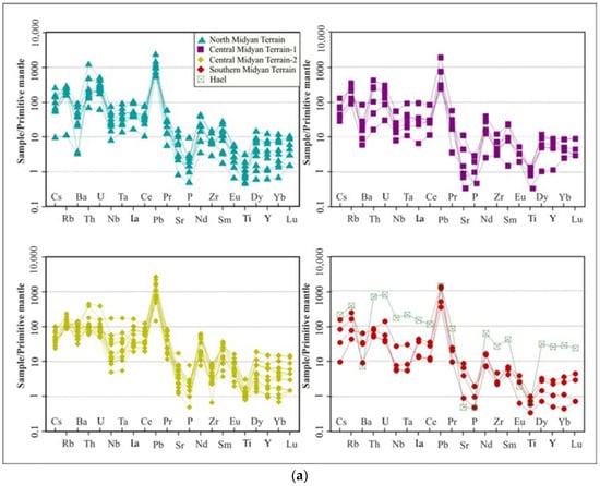 Both plutonic rocks in the Midyan terrain (the Al Bad granite super suite and the Muwaylih suite) intrude into layered volcano–sedimentary country rocks represented by the following rock units, as compiled by Johnson [15] (Figure 2a).