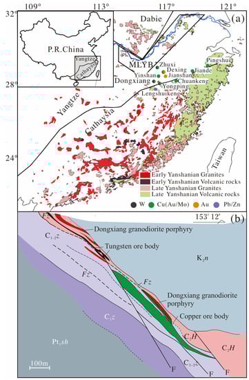 Southeast (SE) China is well-known for its extensive development of Mesozoic igneous rocks (Figure 1a) [1,2]. Due to the large-scale Cu-Au-Pb-Zn-W-Sn polymetallic mineralization and the important tectonic features of this area, its igneous rocks have been studied in great depth [2,3,4,5,6]. The Dexing–Dongxiang district in eastern Jiangnan Orogen (northeast Jiangxi province) and the middle–lower reaches of the Yangtze river valley metallogenic belt (MLYB; Figure 1a) are the two most important metallogenic districts, and both have been studied extensively [7,8]. The Dongxiang W–Cu deposit (E 116°36′34″–116°39′41″, N 28°17′15″–28°17′55″) is located 100 km southwest of the Dexing and Yinshan deposits in the northeast of Jiangxi province. By means of a geological survey, the Dongxiang W–Cu deposit was discovered in the 1950s by the 912 Geological Team of the Jiangxi Bureau of Geology and Mineral Resources. The deposit contains 19,000 t of W with an average grade of 0.65 wt.% W, 0.166 Mt of Cu metal with an average grade of 1.1 wt.% Cu, 1.09 Mt of iron with an average grade of 46 wt.% Fe, and 3.59 Mt of sulfur metal with an average grade of 22 wt.% S [9].
