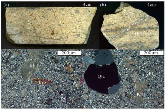 Pictures and photomicrographs of the Dongxiang granodiorite porphyry. (a,b) Hand specimens of Dongxiang granodiorite porphyry samples ZK6701 and DT026; (c,d) photomicrographs showing the mineralogy of the two sample porphyries from the area. Abbreviations: Pl—plagioclase; Kf—alkaline feldspar; Bio—biotite; Qtz—quartz.