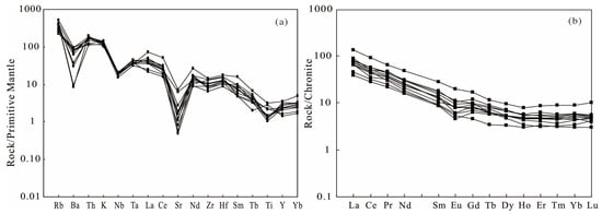 (a) Normalized trace element patterns for the Dongxiang granodiorite porphyry; (b) REE patterns for the Dongxiang granodiorite porphyry. Chondrite and primitive mantle data are from Boynton,1984, respectively [42].