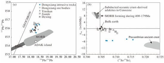 (a) 207Pb/204Pb vs. 206Pb/204Pb diagram and (b) εNd(t) vs. (87Sr/86Sr)i diagram (data from Cai et al., 2017), with (a) showing isotopic signatures for the Dongxiang intrusive rocks [12,21,23,46,47,48]. Data sources are as follows: data of Cenozoic subducted oceanic crust-derived adakites, 400–179 Ma MORB and Dexing adakitic rocks are from Wang et al., 2006 [21]; data of adakites and oceanic slab, Adak Island are from Kay and Hubbard, 1978 [46]; DMM data representing one type of mantle end-members are from Zindler and Hart, 1986 [47]; data of Precambrian ancient crust are from Qi et al., 2007 [48]. Additional data are from Wang et al., 2008 [23].