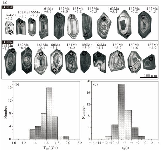 (a) CL images of zircons from Dongxiang granodiorite porphyries (DT050 and DT086) [12]. Smaller circles indicate the spots of U-Pb dating, using data from Cai et al., 2017, whereas the bigger dashed circles indicate the spots of Hf isotopes analyses. Ages and εHf(t) values are shown for each spot (age data are from Cai et al., 2017) [12]. (b) Histogram of two-stage model ages (TDMC) for zircons from the Dongxiang intrusive rocks. (c) Histogram of εHf(t) values for zircons from the Dongxiang intrusive rocks.