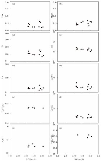 Loss on ignition (LOI) versus TiO2 (a), MgO (b), Zr (c), Nb (d), La (e), La/Yb (f), (87Sr/86Sr)i (g), La/Sm (h), εNd(t) (i), and 207Pb/204Pb (j) for the Dongxiang granodiorite porphyry.
