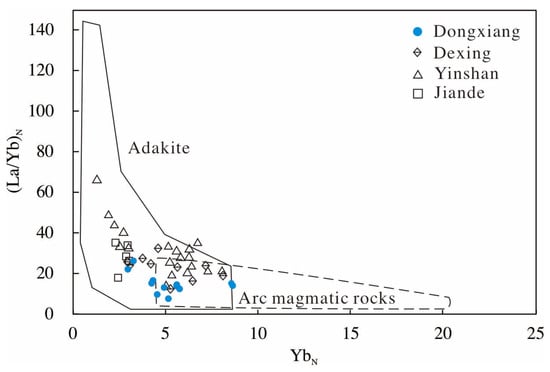 (La/Yb)N vs. YbN for the Dongxiang intrusive rocks (adapted from Defant and Drummond, 1990) [52].